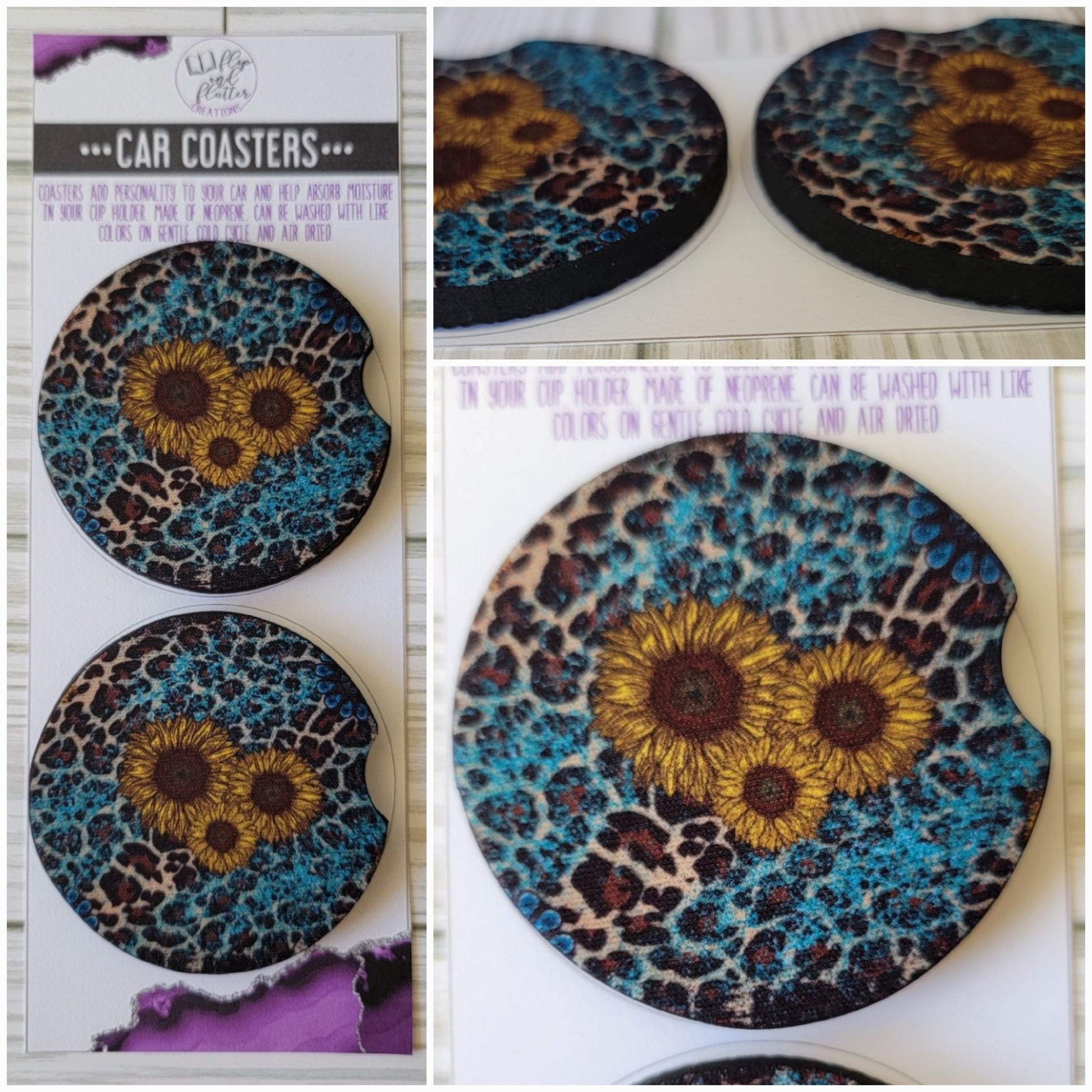 Blue Sunflower Cheetah Print Car Coaster - Set of 2