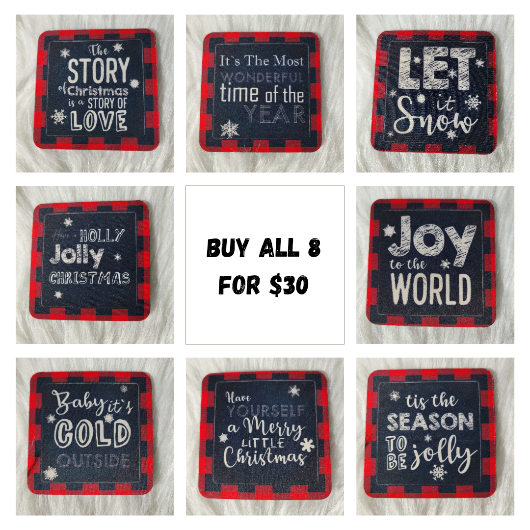 Coasters are made of neoprene. This is a set of eight Christmas sayings coasters. Choose one or all eight!