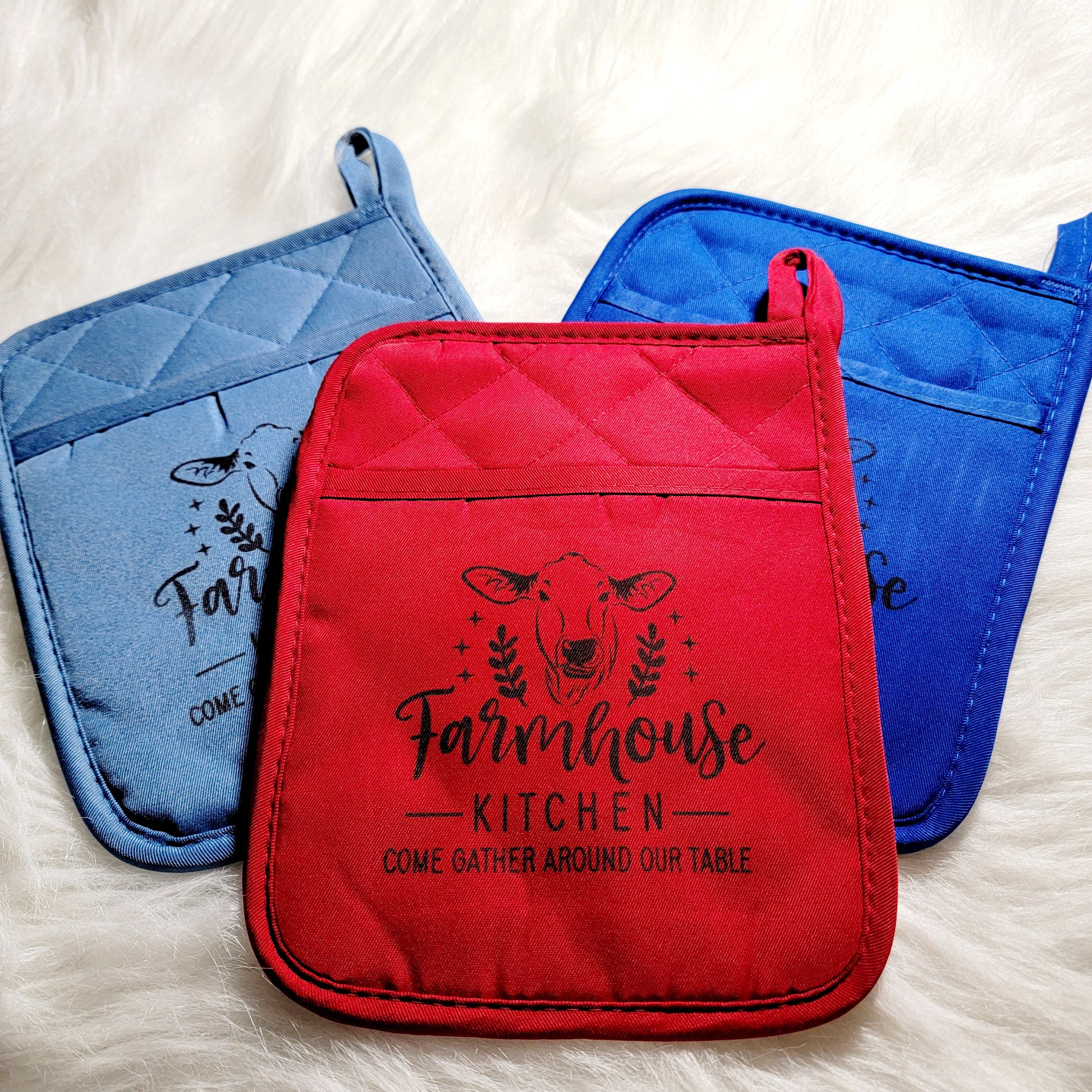 Potholders feature a pocket to making grasping hot pans easier. Designs are sublimated onto the potholder so no worries of melting vinyl!