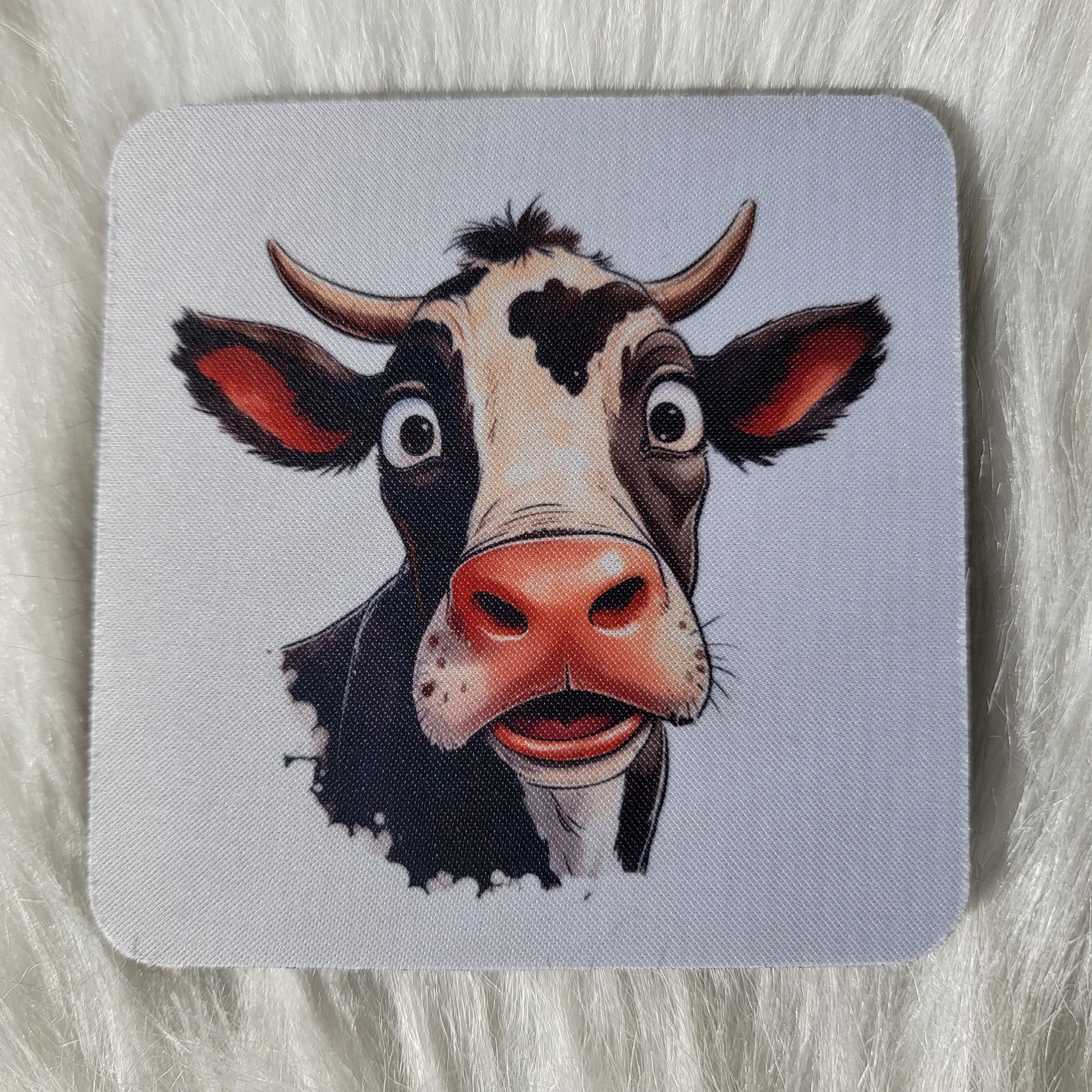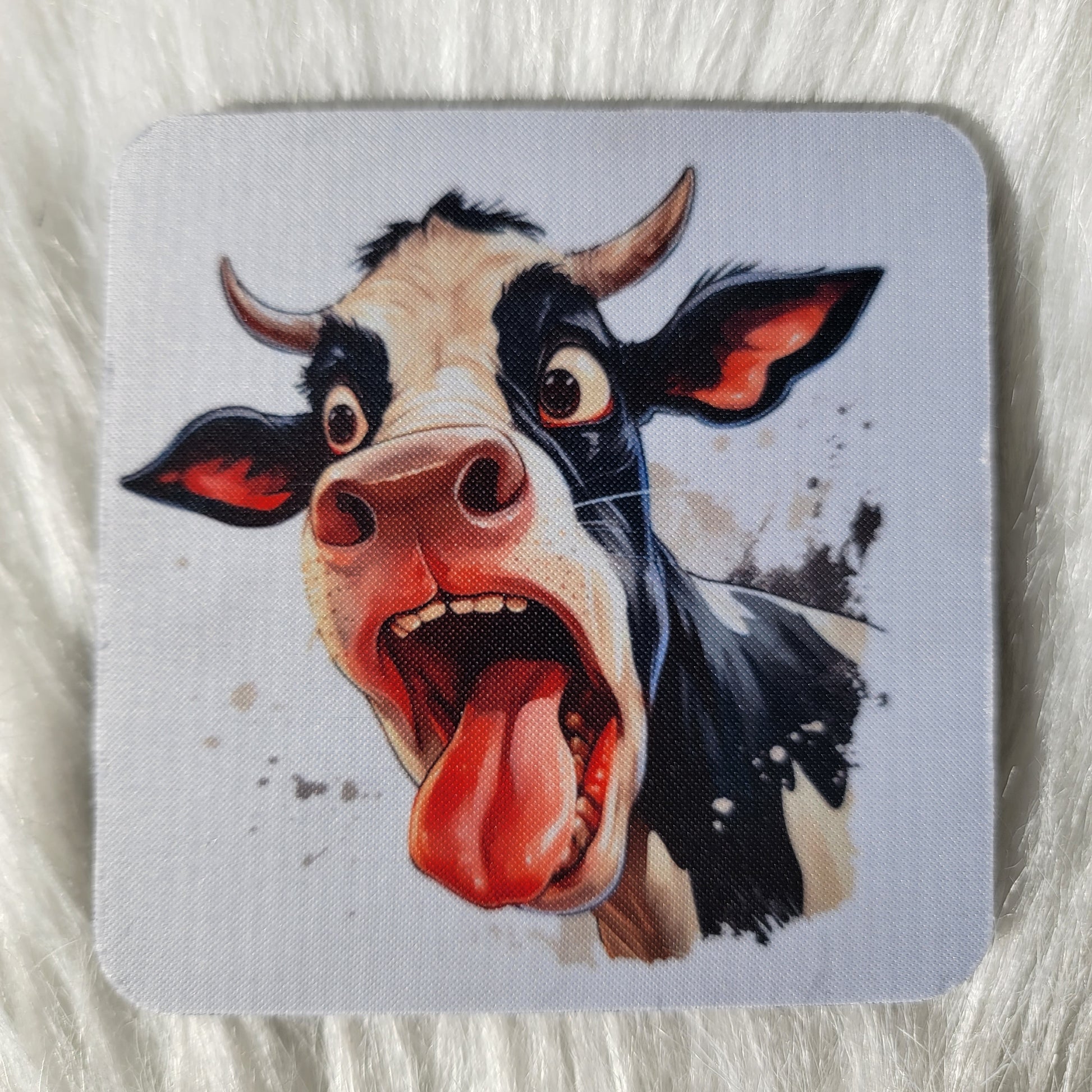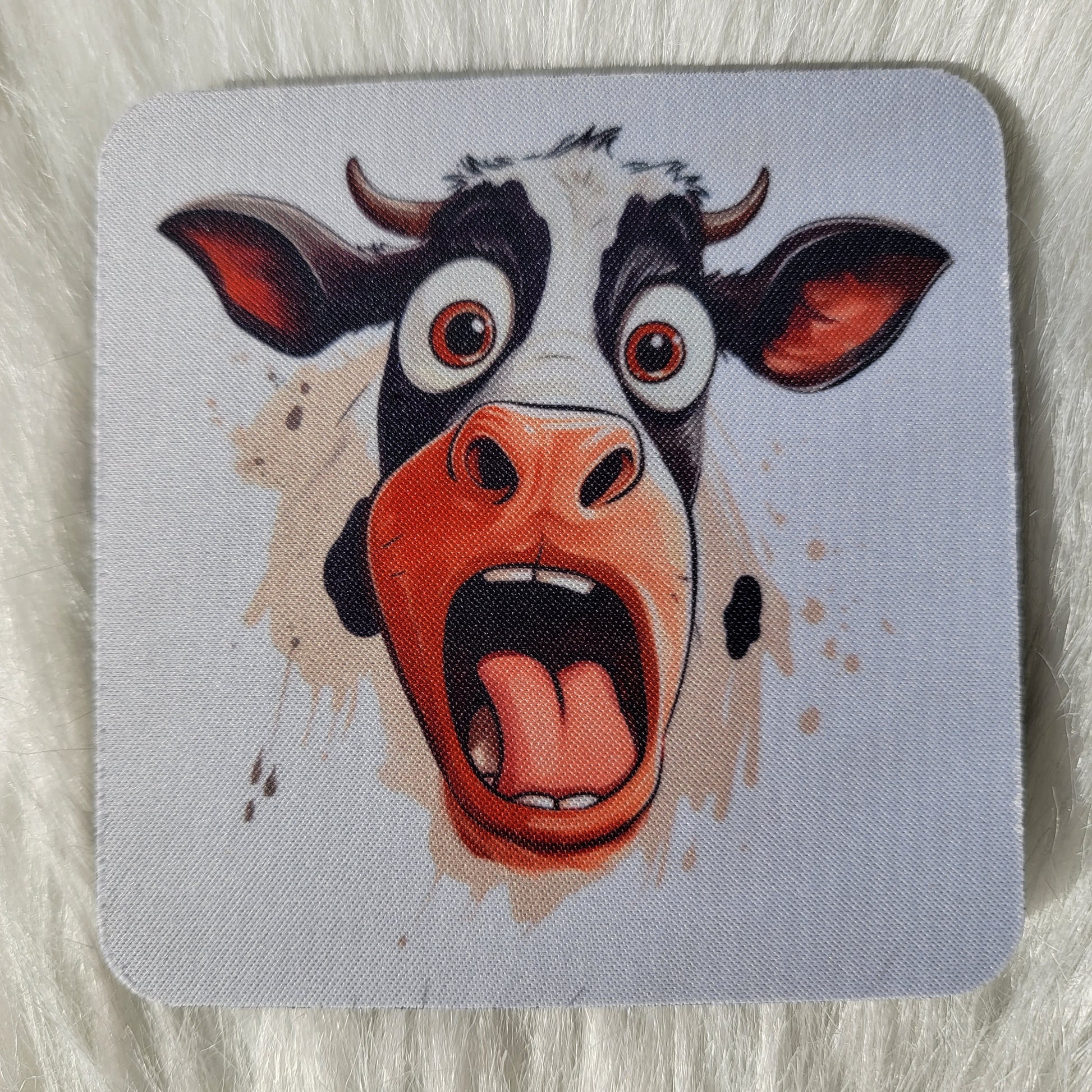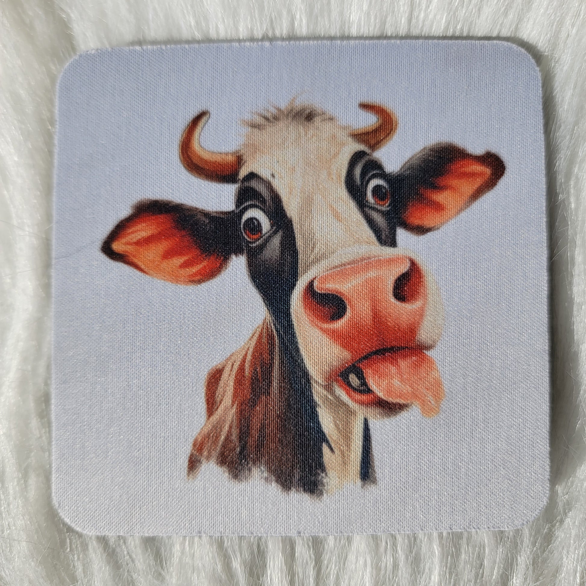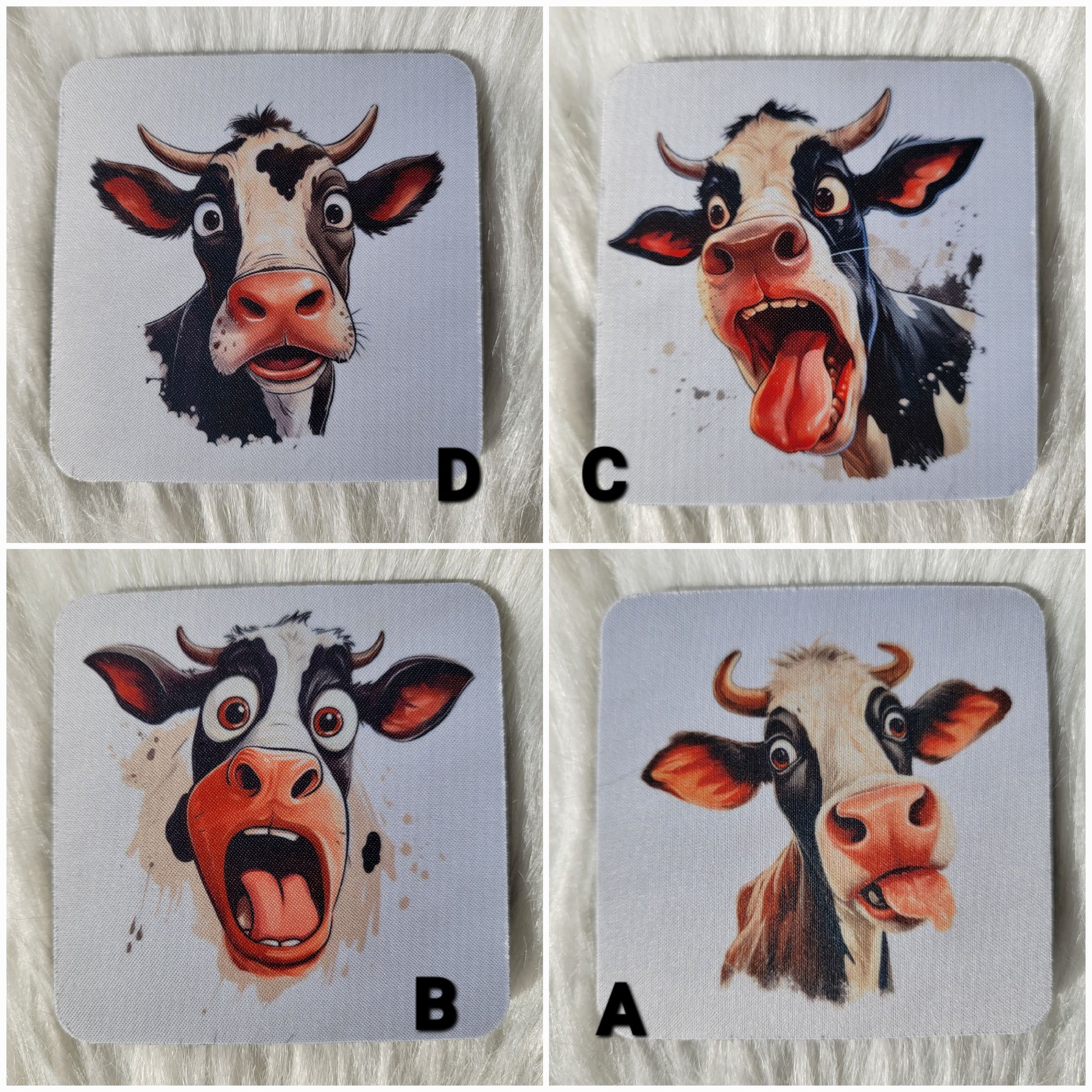 Coasters are made of neoprene. This is a set of four funny cow face coasters. Choose one or all four!