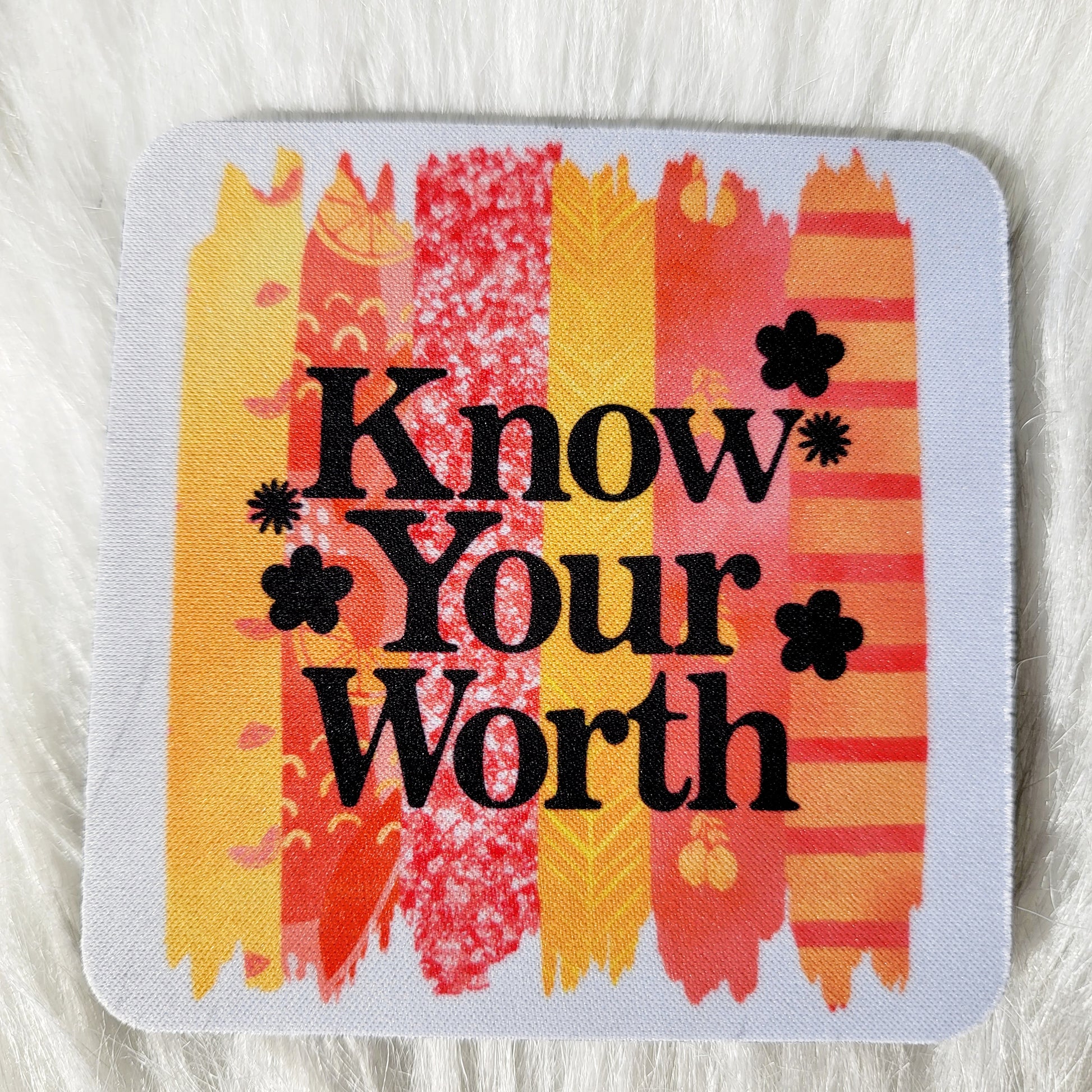 Coasters are made of neoprene. This is a Know Your Worth coaster.