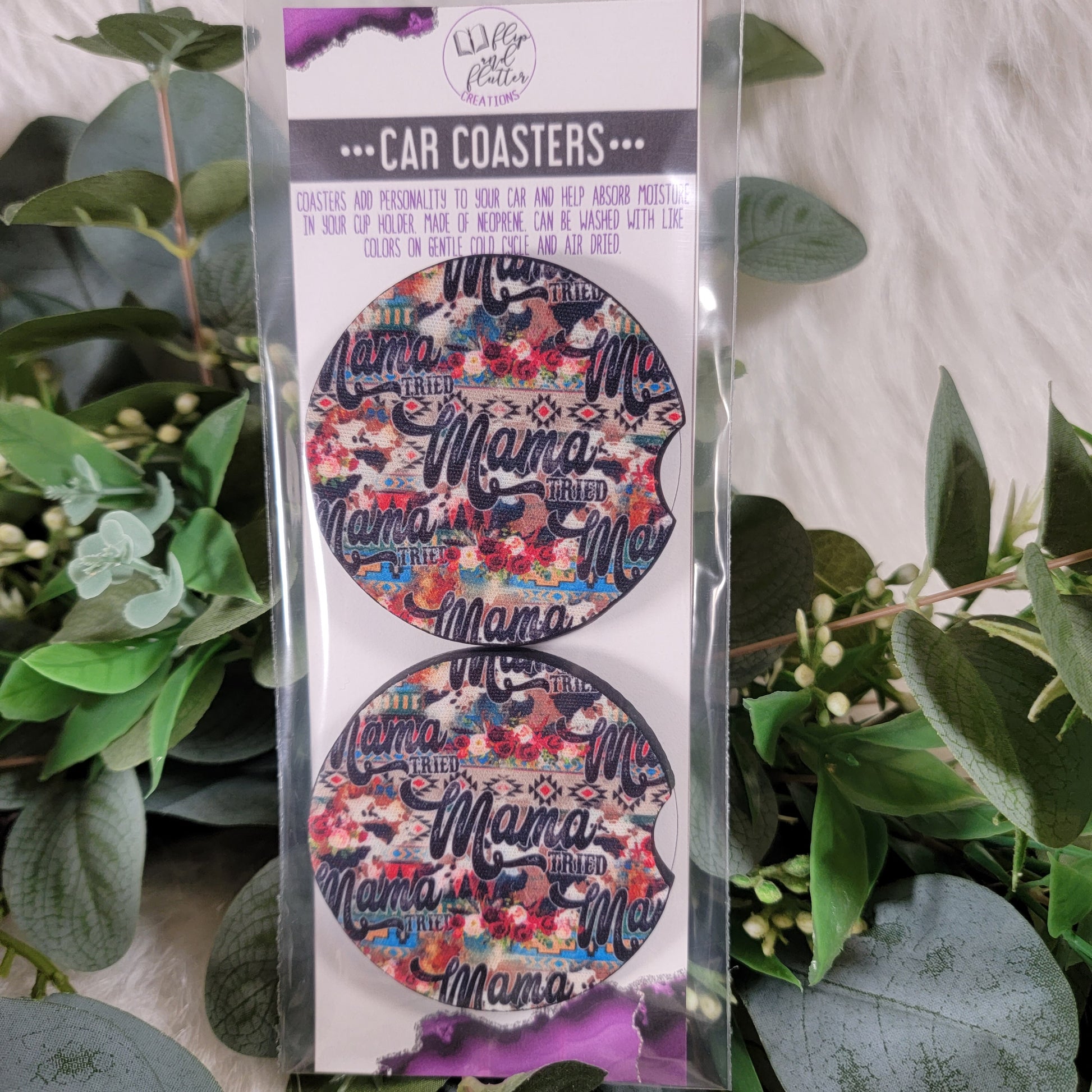 These car coasters provide an ideal touch for any vehicle. Featuring neoprene material and a size that fits most vehicle cup holders, these coasters offer quality and durability.