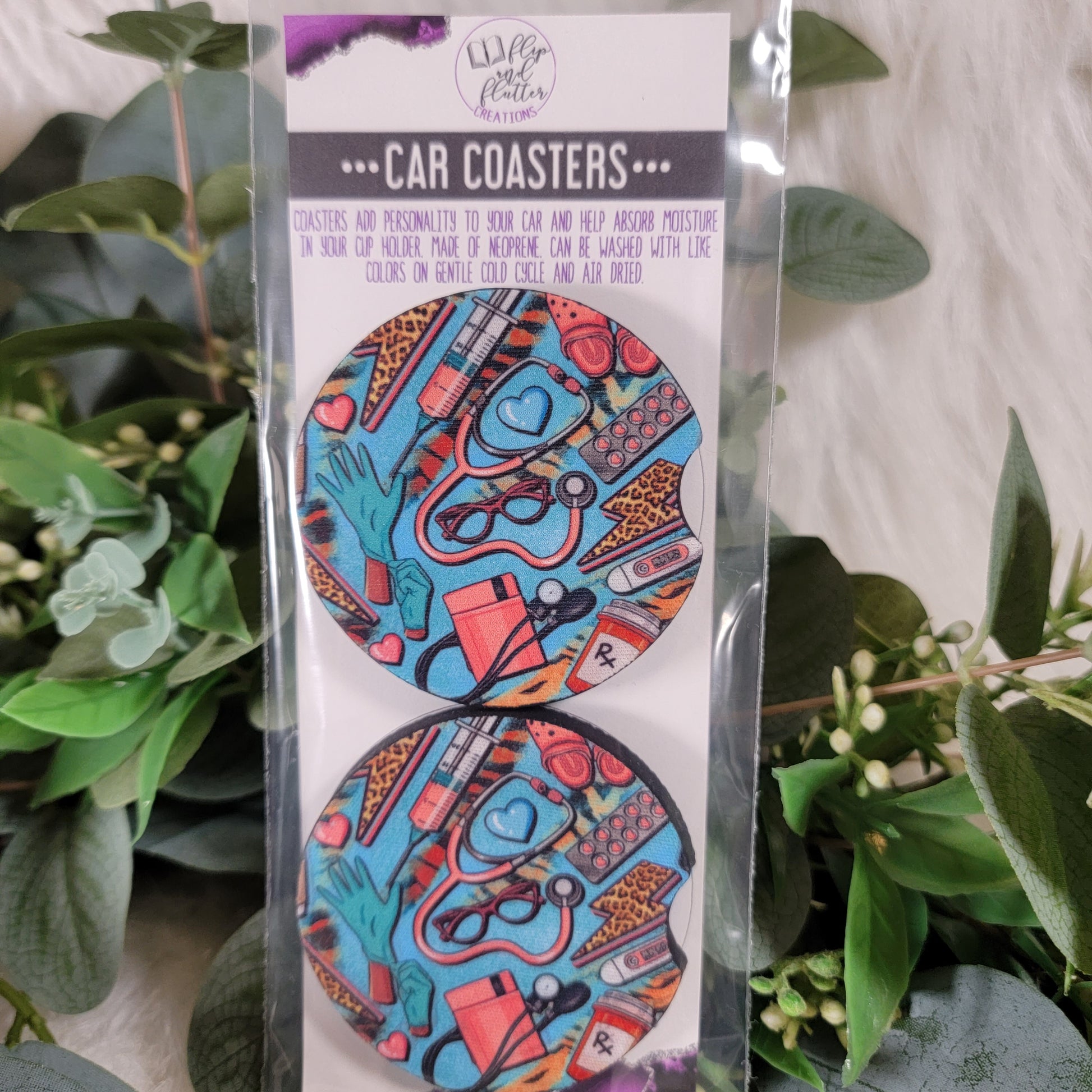 These car coasters provide an ideal touch for any vehicle. Featuring neoprene material and a size that fits most vehicle cup holders, these coasters offer quality and durability.