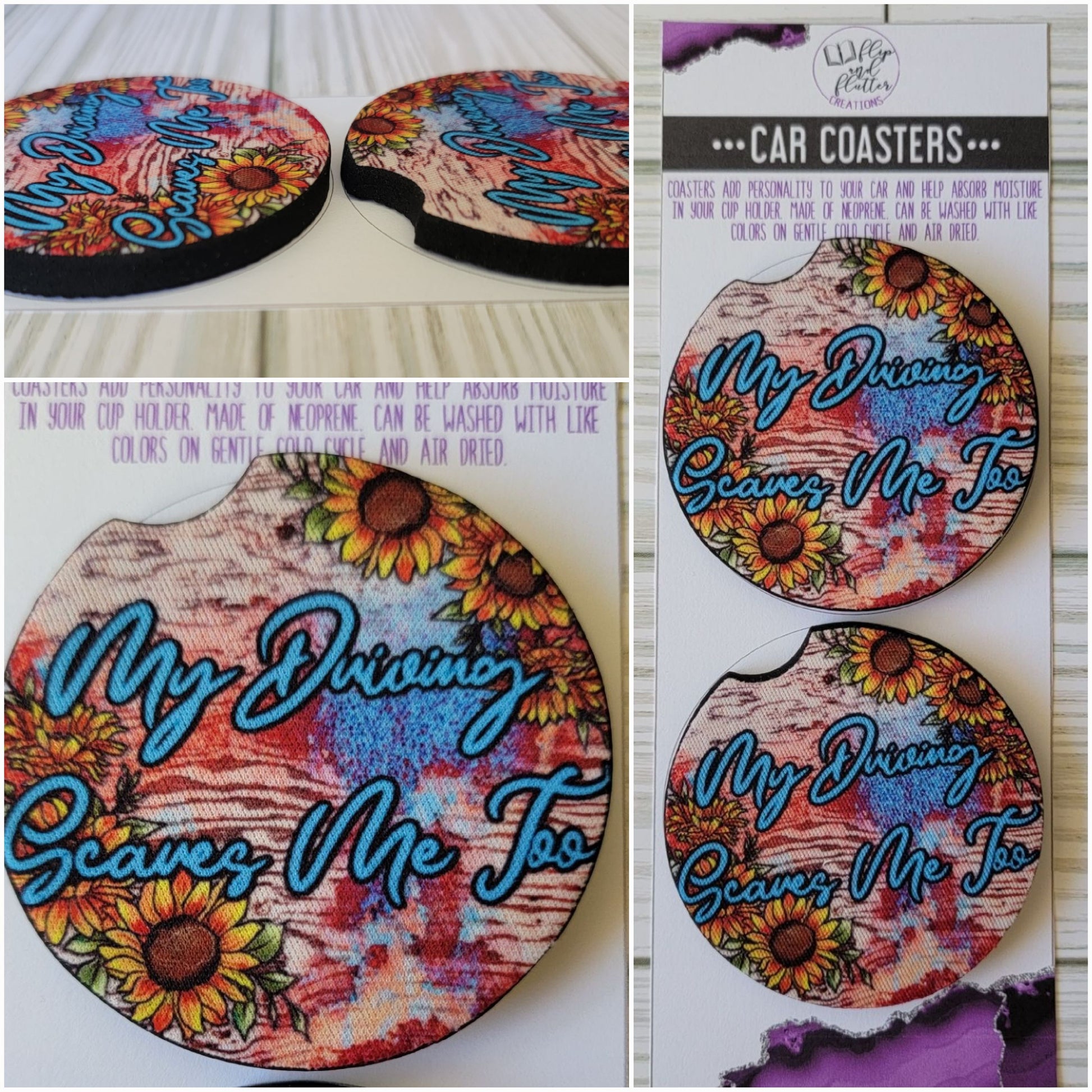 These car coasters provide an ideal touch for any vehicle. Featuring neoprene material and a size that fits most vehicle cup holders, these coasters offer quality and durability.