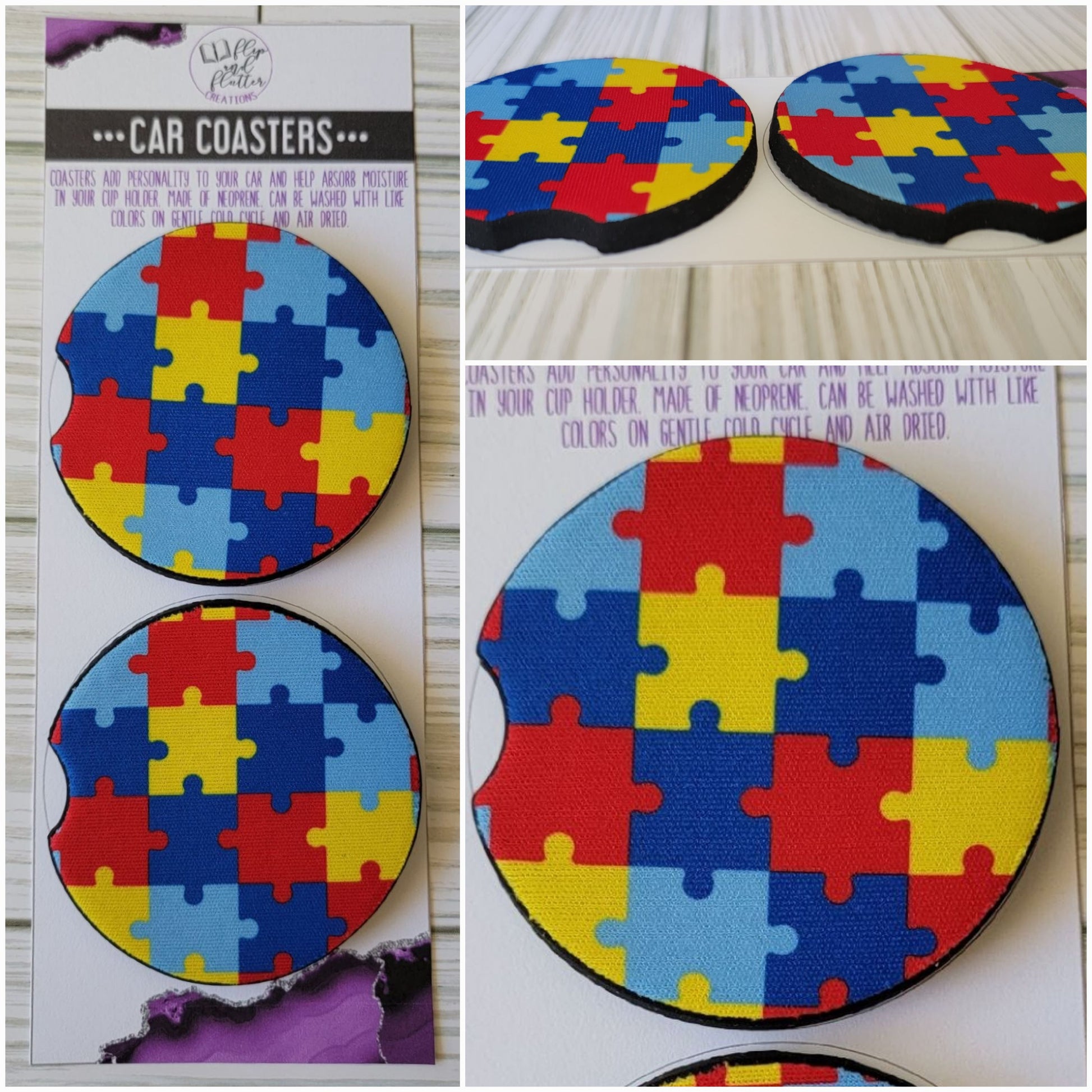 These car coasters provide an ideal touch for any vehicle. Featuring neoprene material and a size that fits most vehicle cup holders, these coasters offer quality and durability.