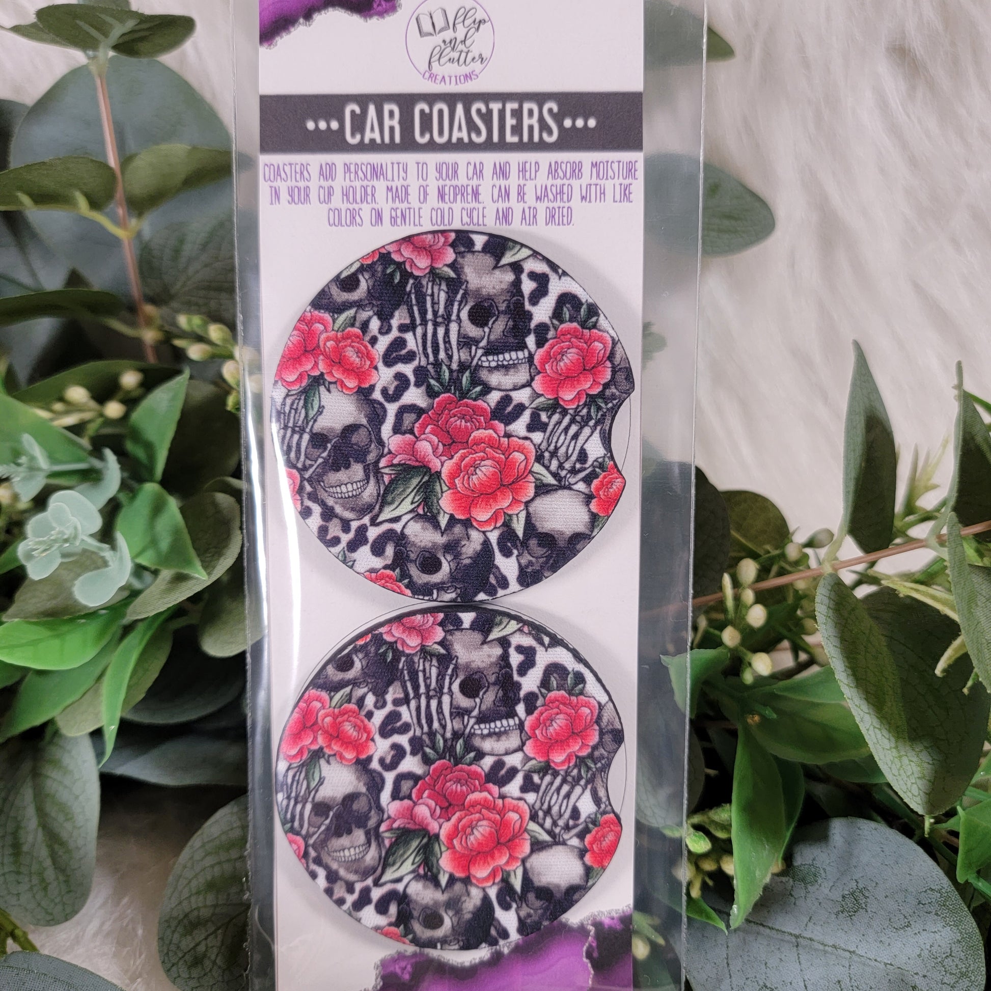 These car coasters provide an ideal touch for any vehicle. Featuring neoprene material and a size that fits most vehicle cup holders, these coasters offer quality and durability.